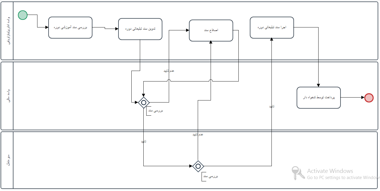 - شرح فرآیند : در این فرآیند، واحد اداری یا بازاریابی سند آموزشی تصویب شده را بررسی کرده و بر اساس آن سند تبلیغاتی دوره را تنظیم می نماید، پس از تنظیم این سند، بایستی آن را به تائید واحد مالی و مدیرعامل رسانده و سپس آن را اجرا نماید.