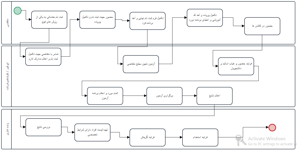 شرح فرآیند: متقاضی زمانیکه با دوره آشنا شد (از هر طریقی مثل تبلیغات) با یکی از سه روش فوق بایستی ثبت نام مقدماتی خود را انجام دهد، پس از ثبت نام مقدماتی، اپراتور شرکت با وی تماس گرفته تا جهت تکمیل ثبت نام و تشکیل پرونده حضور پیدا کند، متقاضی در شرکت به همراه مدارک حضور می یابد، پس از تکمیل فرم ثبت نام (نهائی) بایستی برنامه شخصی وی اخذ شود تا مشخص گردد زمان های خالی فرد چگونه است، پس از این بایستی متناسب با دوره انتخابی، آزمون تعیین سطح بدهد، پس از تعیین سطح، پرونده وی تکمیل شده و برنامه دوره اعطا می گردد همچنین کد آموزشی فرد نیز اخذ می شود و اعلام می گردد. فرد موظف است طبق برنامه دوره( که ممکن است زمان حضور در کلاس ها مشخص باشد یا قرار باشد بعداً اطلاع رسانی شود) در کلاس ها حضور پیدا کند، همچنین فرآیند حضور و غیاب نیز در طی برگزاری دوره برقرار است، پس از اتمام دوره توسط مدرس، برنامه آزمون به تمامی متقاضیان اعلام شده و طبق برنامه، آزمون به عمل می آید، نتایج آزمون آماده شده و در سایت قرار می گیرد، سپس لیستی از متقاضیان واجدالشرایط آماده شده و تحویل مدیریت اداری جهت گزینش و استخدام می گردد.
