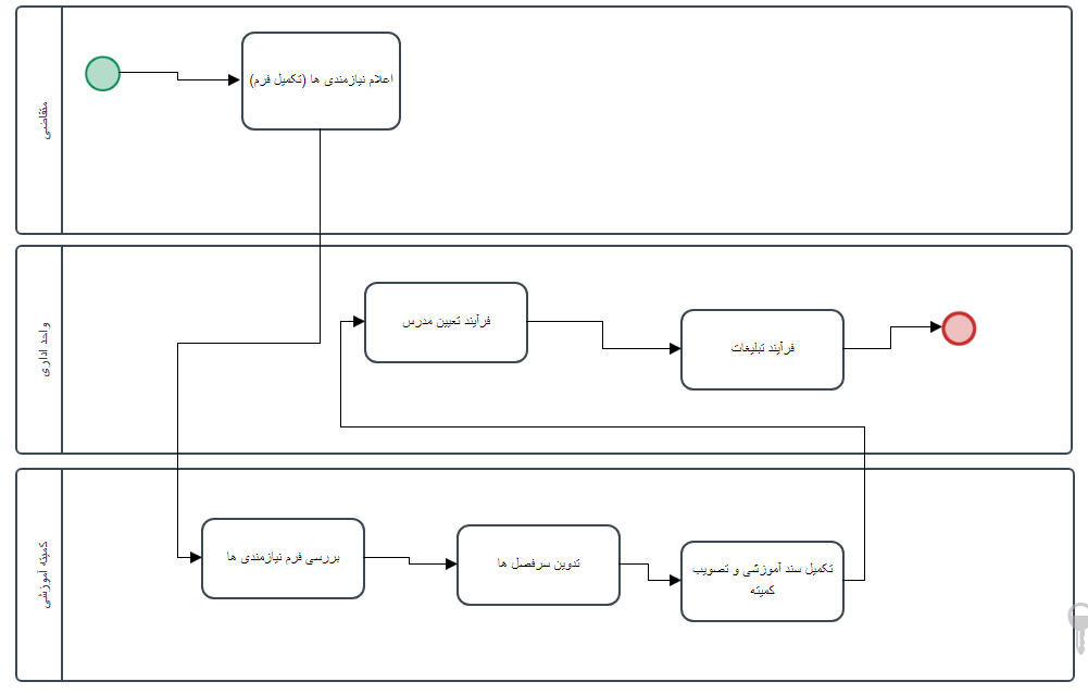 پس از اینکه سند آموزشی دوره به تصویب رسید جهت مشخص شدن مدرس و شروع تبلیغات به واحد اداری ارجاع داده شده تا بررسی شده و اقدامات لازم انجام شود.